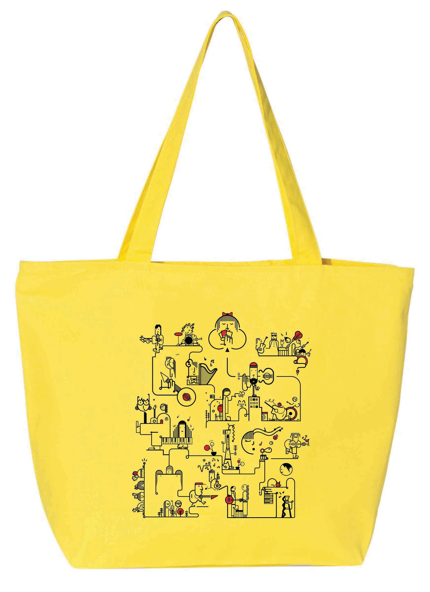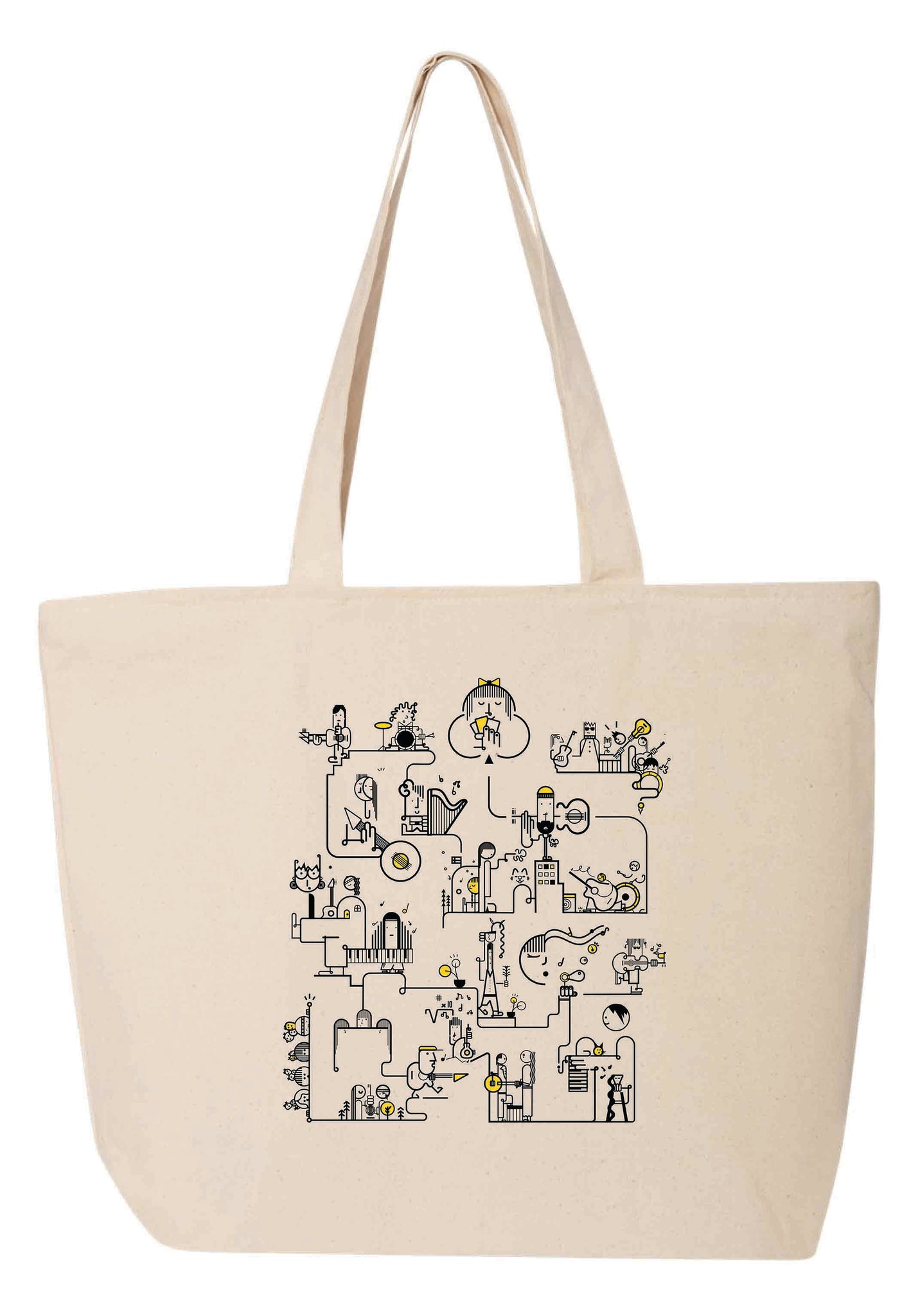 Better than your average cheap tote. Two sided, showing both images from the two Ba Da Bing shirts. Higher quality fabric, wider, and it's got a zipper on top, as well as an inside pocket that zippers up.