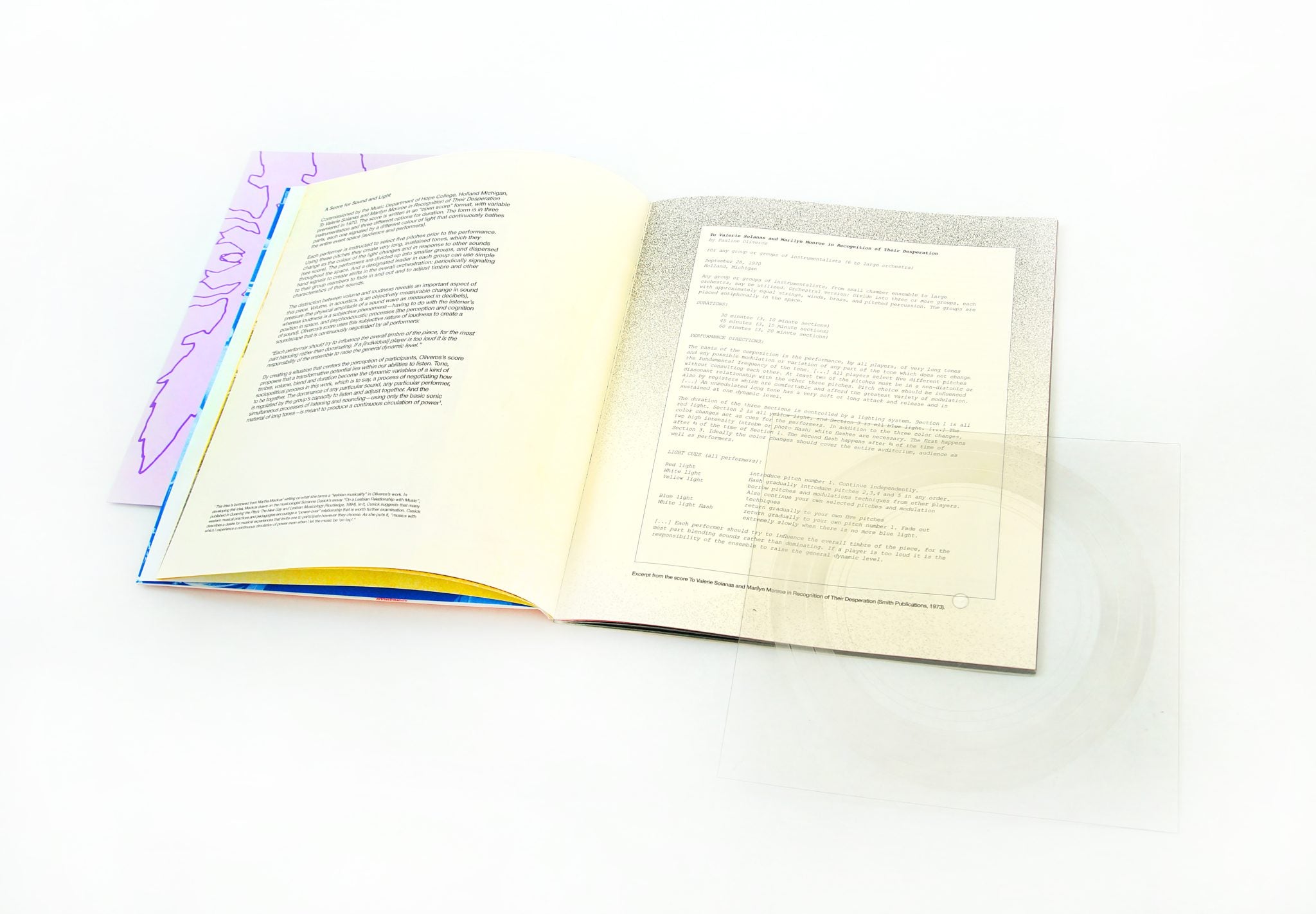 Book: Writing, scores, a previously unpublished archival text by Oliveros (1979), photography, and a Flexi Disc with listening score.